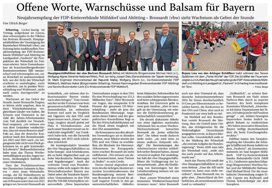 Der Hauptgeschäftsführer der Vereinigung der Bayerischen Wirtschaft, Herr Bertram Brossardt, war Hauptredner beim diesjährigen Neujahrsempfang der FDP Kreisverbände Mühldorf und Altötting.